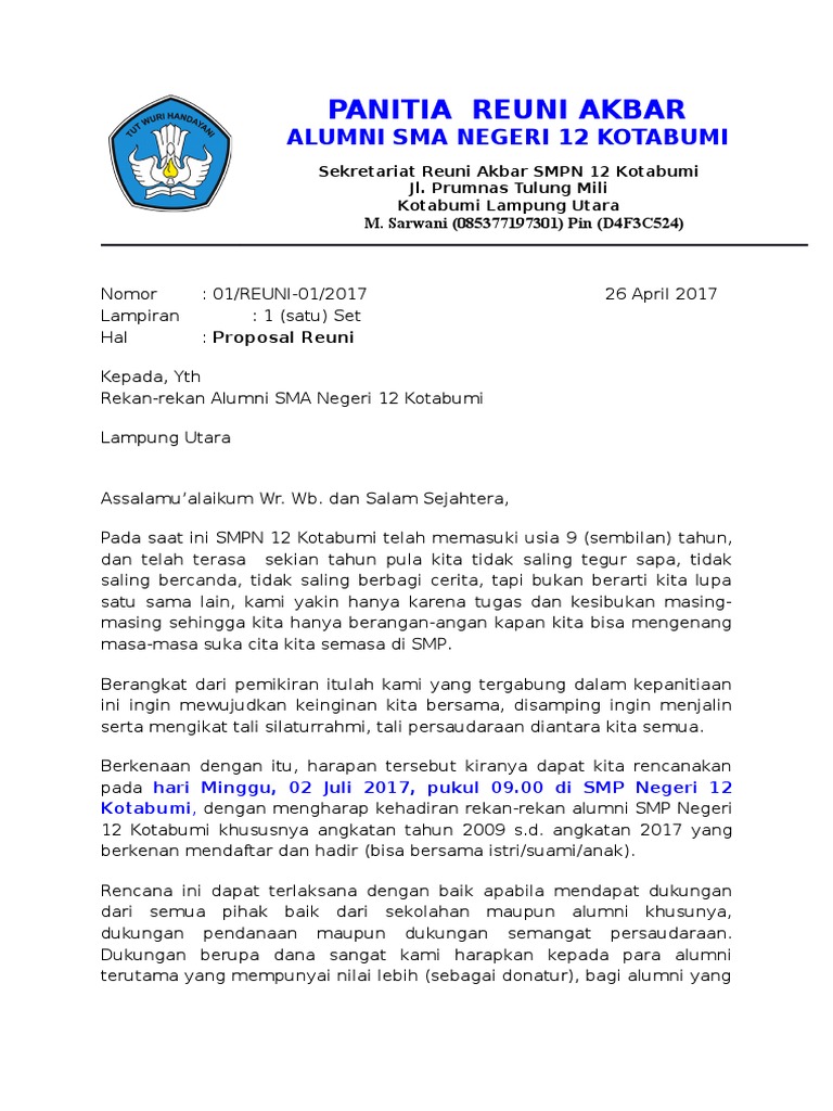 Proposal Reuni Smp from demo.dokumen.tips Organisasi siswa intra sekolah sma negeri 1 medan jl. 1 buah proposal hal : email protected medan, 13 agustus 2020. Webmasters, you can add your site in. Namun, jika acara reuni dilangsungkan diluar sekolah, seperti di gedung, restoran, dan sebagainya, maka anda harus membuat surat permohonan izin tempat untuk melangsungkan acara reuni tersebut. Come and visit our site, already thousands of classified ads await you. Kepada yth, bapak kepala sekolah sma negeri 1 medan di tempat. Contoh penutup proposal reuni semoga dzat yang maha pengasih dan penyayang meridhoi rencana mulia untuk menyambung kembali tali silaturahim ini, sehingga acara reuni smp negeri 245 jakarta, angkatan 1997, dapat berjalan dengan baik, lancar, dan sukses.