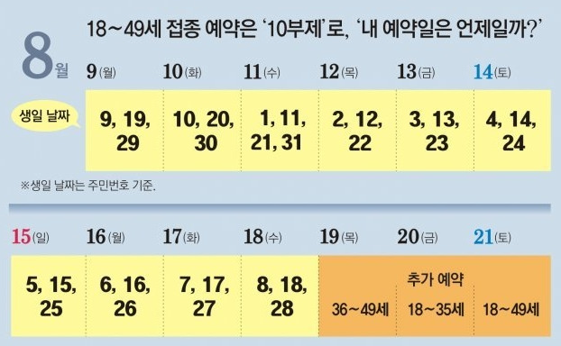 .사전예약,생년월일,10부제 사전예약,백신 사전예약,예방접종 사전예약,코로나19,covid19,백신,예약 18~49세 코로나19 백신 10부제 사전예약 일정.